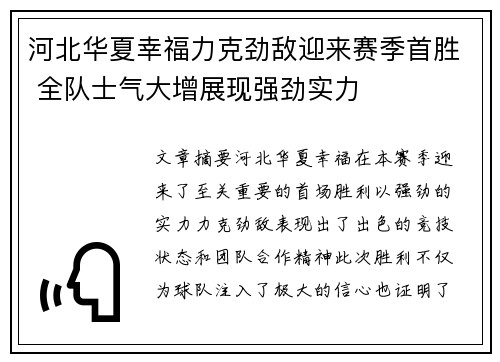 河北华夏幸福力克劲敌迎来赛季首胜 全队士气大增展现强劲实力